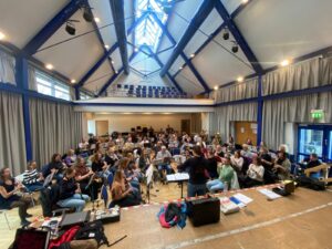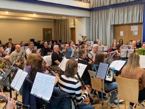 Am 25.10.2025 fand unser SBO-Tag statt. Bei dieser Gelegenheit konnten Interessenten einfach mal reinschnuppern, mitproben und das SBO hautnah erleben. 15 Schnupperkandidaten haben sich mit 50 Mitgliedern des SBO im Bürgersaal in Schwieberdingen eingefunden und es wurden unter anderem Resplendent Glory von Rossano Galante und Messengers of Light von Thomas Doss probiert. Im Anschluss wurde gemeinsam gegessen und wir sind mit unseren ‚Schnupperern‘ ins Gespräch gekommen.